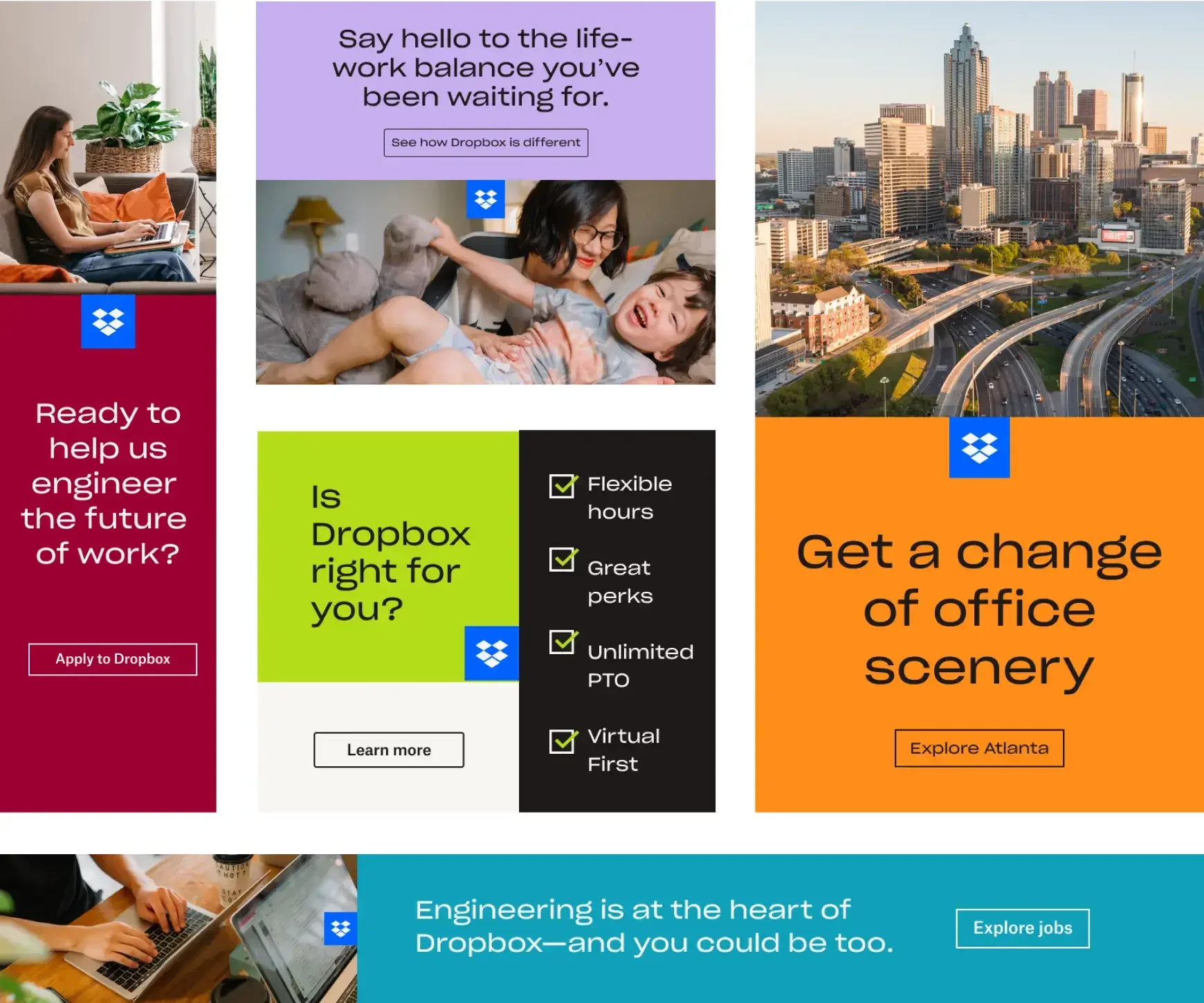 Dropbox ads showcase how expressive imagery and bold design can stay fresh while remaining true to the brand system.